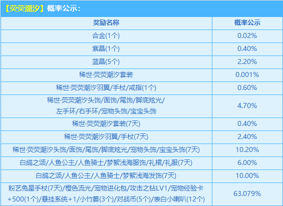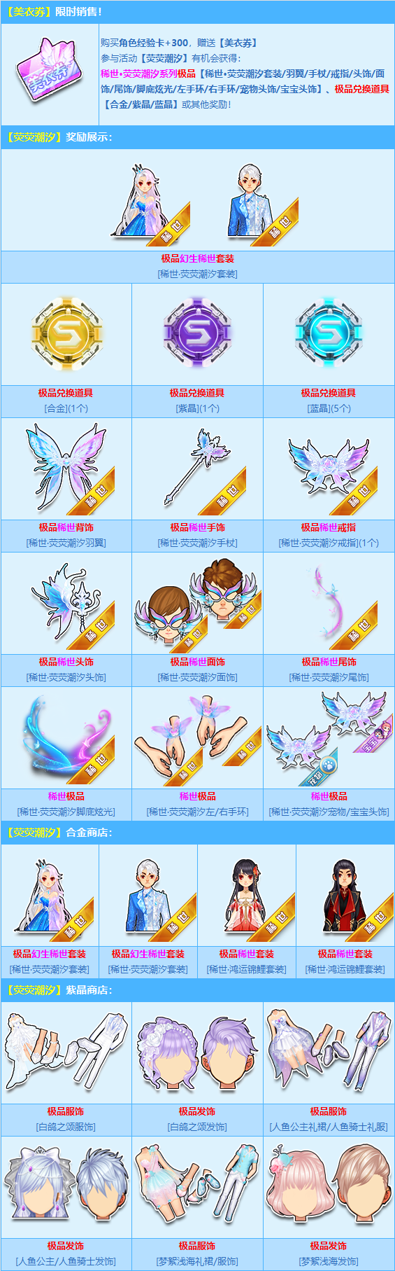 10月6日-10月31日,购买角色经验卡+300,赠送【美衣券】,参与活动【荧荧潮汐】有机会获得:幻生功能稀世臻品系列极品【稀世·荧荧潮汐套装/羽翼/手杖/戒指/头饰/面饰/尾饰/脚底炫光/左手环/右手环/宠物头饰/宝宝头饰】、极品兑换道具【合金/紫晶/蓝晶】或其他奖励之一!