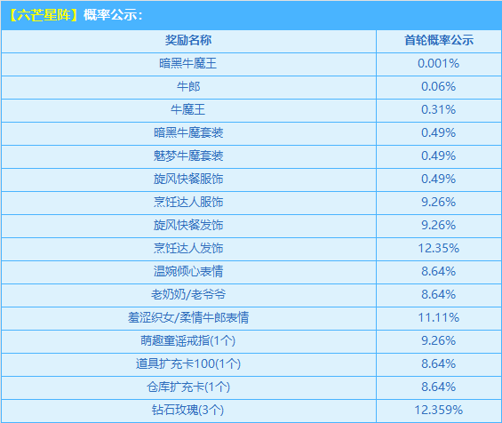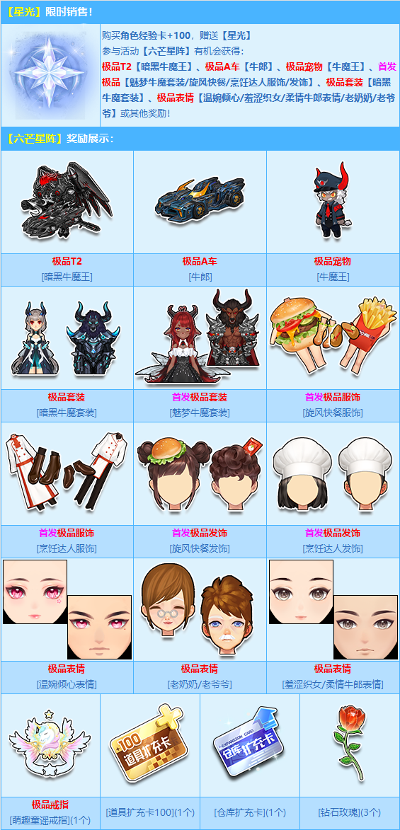 7月26日-8月31日,购买角色经验卡+100,赠送【星光】,参与活动【六芒星阵】抽取【星芒】进入【星阵】必得以下极品奖励:极品T2【暗黑牛魔王】、极品A车【牛郎】、极品宠物【牛魔王】、首发极品【魅梦牛魔套装/旋风快餐/烹饪达人服饰/发饰】、极品套装【暗黑牛魔套装】、极品表情【温婉倾心/羞涩织女/柔情牛郎表情/老奶奶/老爷爷】或其他奖励之一!