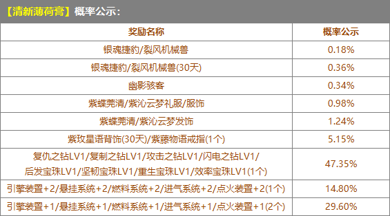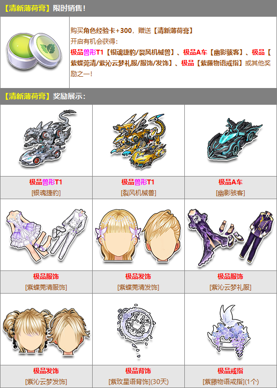 8月3日-9月14日,购买角色经验卡+300,赠送【清新薄荷膏】,有机会得极品兽形T1【银魂捷豹/裂风机械兽】、极品A车【幽影骇客】、极品【紫蝶莞清/紫沁云梦礼服/服饰/发饰】、极品【紫藤物语戒指】或其他奖励之一!