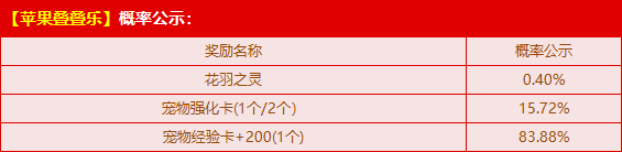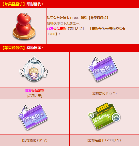 8月3日-9月14日,购买角色经验卡+100,赠送【苹果叠叠乐】,随机获得以下奖励之一:首发极品宠物【花羽之灵】、【宠物强化卡/宠物经验卡+200】!