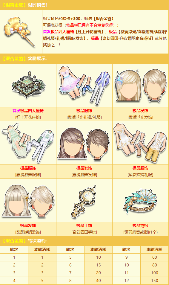 8月2日-9月14日,购买角色经验卡+300,赠送【银杏金簪】,有机会得(物品栏已拥有不会重复获得):首发极品四人座椅【杠上开花座椅】、极品【微澜浮光/春漫游舞/梨影婵娟礼服/礼裙/服饰/发饰】、极品【奇幻四国手杖/翎羽扇音戒指】或其他奖励之一!