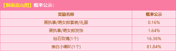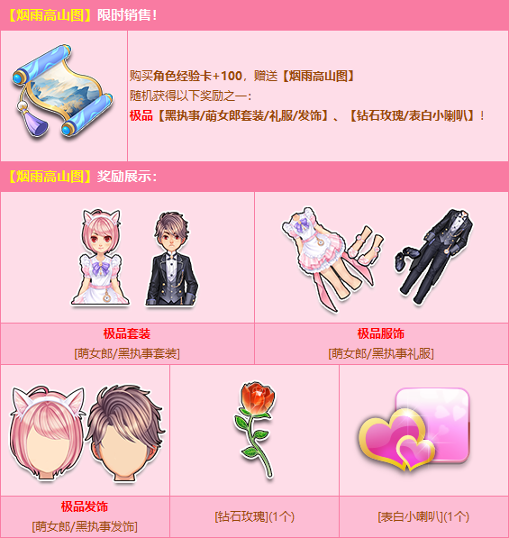 8月2日-9月14日,购买角色经验卡+100,赠送【烟雨高山图】,随机获得以下奖励之一:极品【黑执事/萌女郎套装/礼服/发饰】、【钻石玫瑰/表白小喇叭】!