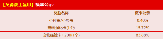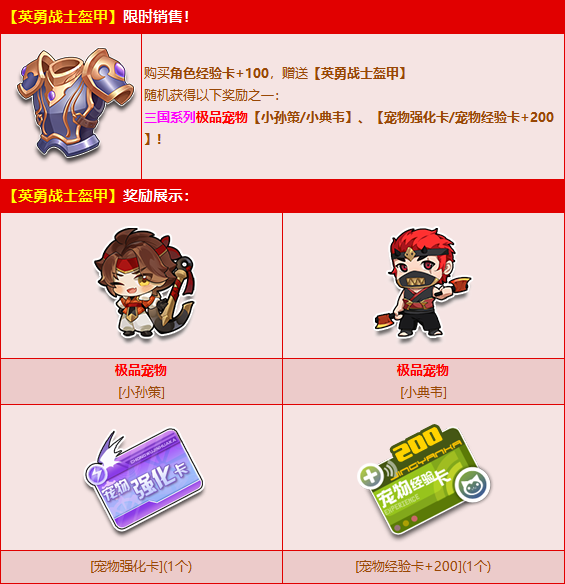 8月2日-9月14日,购买角色经验卡+100,赠送【英勇战士盔甲】,随机获得以下奖励之一:三国系列极品宠物【小孙策/小典韦】、【宠物强化卡/宠物经验卡+200】!