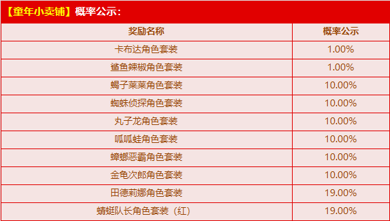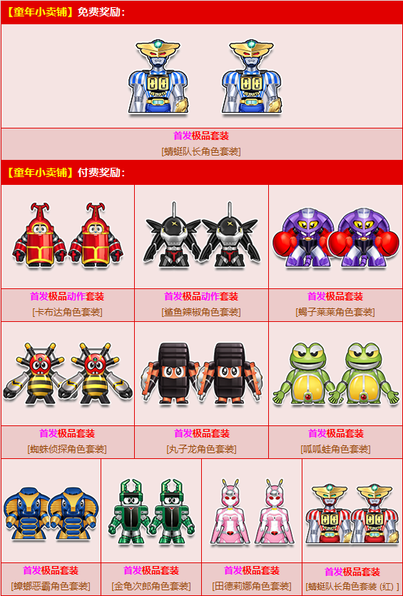 8月1日-10月31日,参与活动【童年小卖部】,有机会获得以下奖励之一(已拥有的角色套装不会重复获得):首发动作极品角色套装【卡布达/鲨鱼辣椒角色套装】、首发极品角色套装【蟑螂恶霸/蜘蛛侦探/金龟次郎/丸子龙/呱呱蛙/蝎子莱莱/田德莉娜角色套装/蜻蜓队长角色套装(红)】!