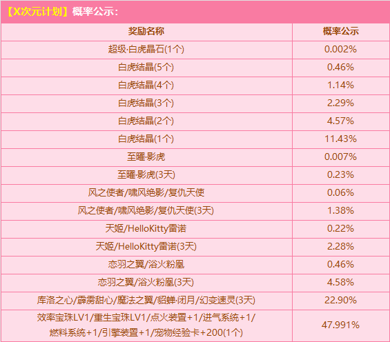 2、至曜级极品S车【至曜·影虎】及其三形态机娘赛车皮肤【X次元-白虎】、首发炫彩机娘赛车皮肤【白虎-海滩派对】、极品S车【风之使者/啸风绝影/银凌闪电】、极品T2【复仇天使】、极品T1【天姬】、极品A车【HelloKitty雷诺/恋羽之翼/浴火粉凰/极速神音/超越/津波】、极品宠物【冰魄白虎/闹春小虎队】、极品兑换道具【超级·白虎晶石/白虎结晶】或其他奖励!