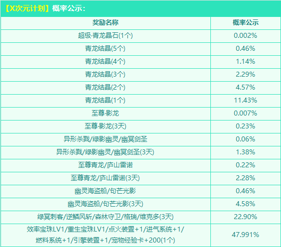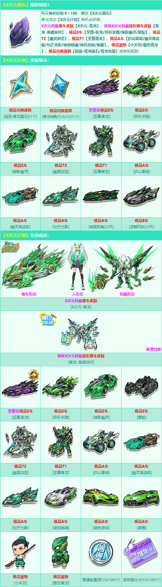 1、至尊级极品S车【至尊·影龙】及其三形态机娘赛车皮肤【X次元-青龙】、首发炫彩机娘赛车皮肤【青龙-海滩派对】、极品S车【异形杀戮/绿影幽灵/雷蛇】、极品T2【幽冥剑圣】、极品T1【至尊青龙】、极品A车【庐山雷诺/幽灵海盗船/句芒光影/绿剑销魂/绿色游侠/绿雁】、极品宠物【小关羽/傲世青龙】、极品兑换道具【超级·青龙晶石/青龙结晶】或其他奖励!