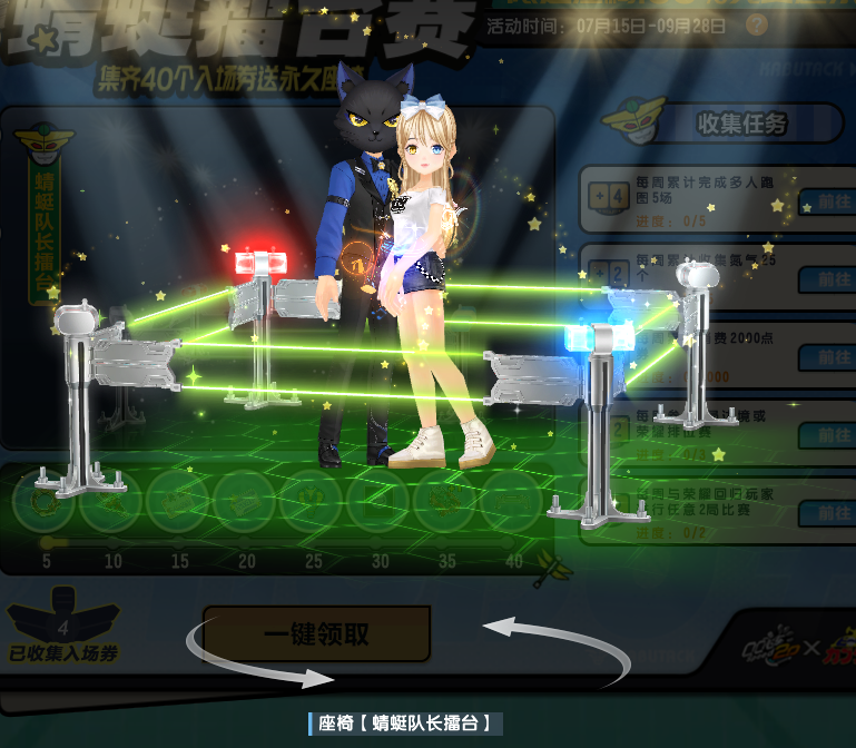 活动开启后,车手们进入【蜻蜓擂台赛】活动页面,收集指定数量的【入场券】即可领取阶段好礼!集齐20张【入场券】即可领取卡布达头像框和永久联动【三人组名片夹】,集齐40张【入场券】更能解锁永久双人限定特效座椅【蜻蜓队长擂台】!