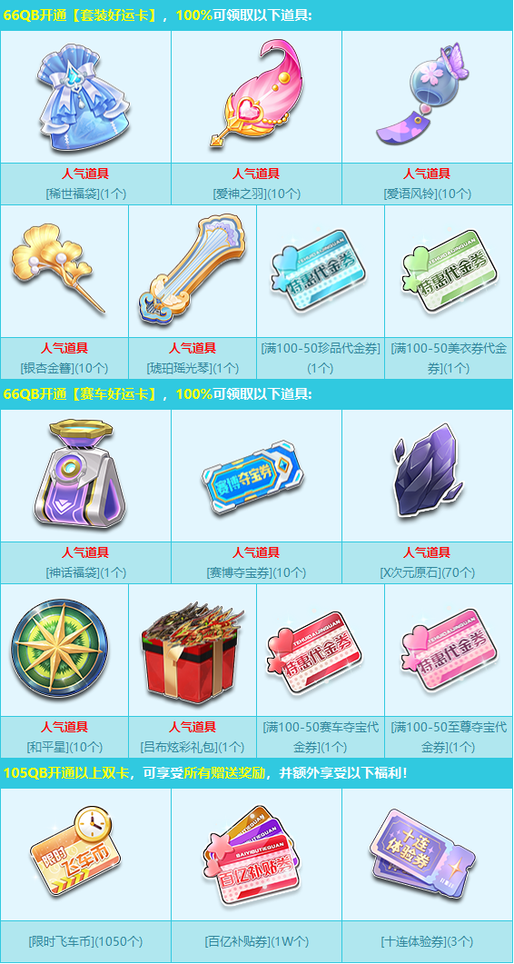8月1日-8月31日,参与【夏日好运卡】活动玩法,66元开通【套装好运卡/赛车好运卡】100%领取对应的商城人气道具与限定代金券,同时开通双卡仅需105元,额外享受超值福利,惊喜不容错过!
