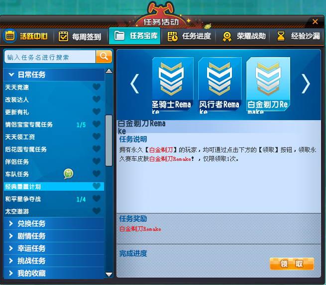 自2025年8月1日起,拥有S白金剃刀(永久)的玩家,均可以免费领取到赛车皮肤S白金剃刀Remake!通过游戏任务面板中的经典重置计划即可领取!