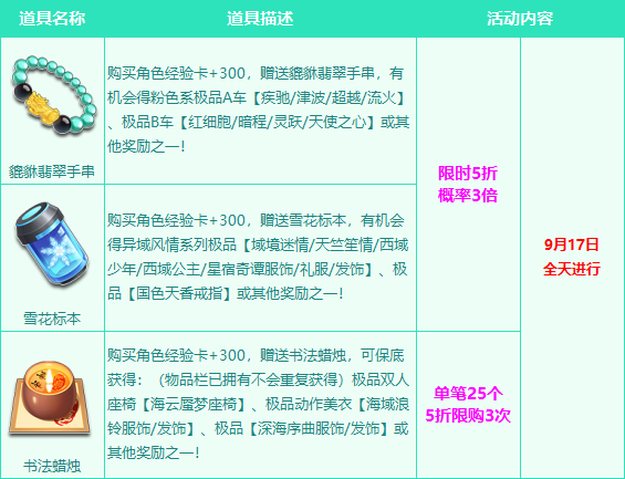 9月17日,三款人气宝箱全天5折优惠来袭,更有超值限购与3倍概率助你赢取粉红系列极品A车【疾驰/津波/超越/流火】、极品动作美衣【海域浪铃服饰/发饰】、异域风情系列极品【域境迷情/天竺笙情/西域少年/西域公主/星宿奇谭服饰/礼服/发饰】等其他极品奖励,惊喜不容错过!