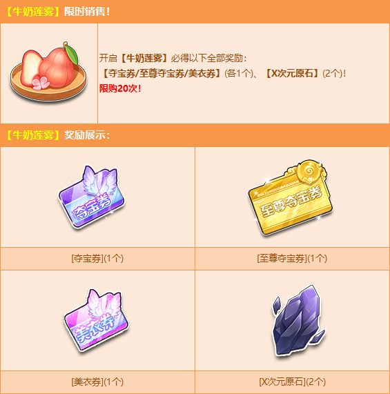 9月20日-9月30日,惊喜福利!惊爆价24飞车币,即可获得【牛奶莲雾】,开启获得以下全部奖励:【夺宝券/至尊夺宝券/美衣券】各1个、【X次元原石】2个!每Q限购20次!