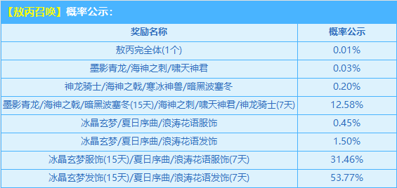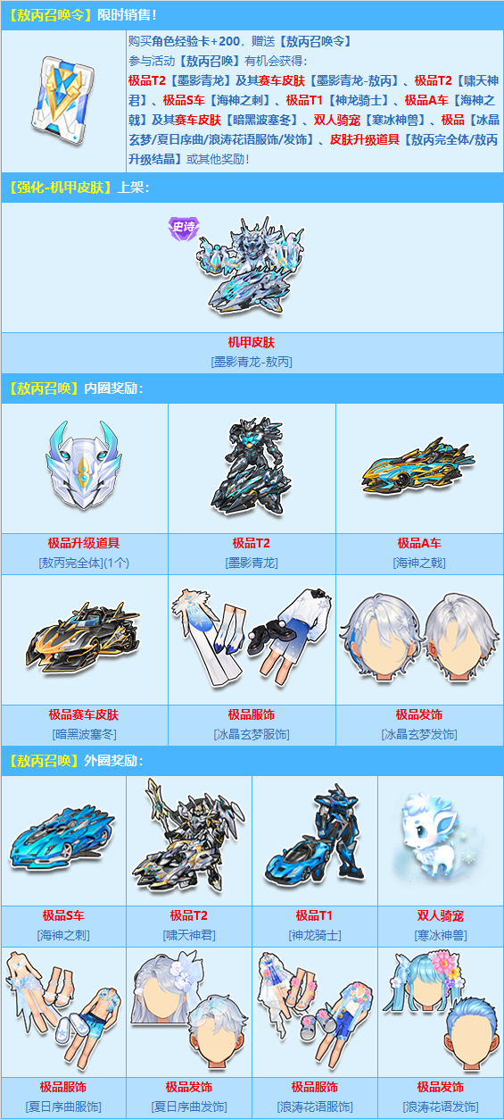 9月20日-10月19日,购买角色经验卡+200,赠送【敖丙召唤令】,开启有机会获得极品T2【墨影青龙】及其赛车皮肤【墨影青龙-敖丙】、极品S车【海神之刺】、极品T2【啸天神君】、极品T1【神龙骑士】、极品美衣【冰晶玄梦/夏日序曲/浪涛花语服饰/发饰】以及其他极品奖励!