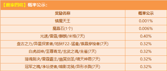 9月20日-10月19日,购买角色经验卡+500,赠送【高级镇魔符】,参与活动【魔家四将】有机会获得极品T2【镇魔天王】及其封神演义系列赛车皮肤【镇魔天王-魔礼红/镇魔天王-魔礼寿/镇魔天王-魔礼青/镇魔天王-魔礼海】、极品兑换道具【魔晶石】、极品A车【暗-天蓬】、联动极品动作美衣【帝皇铠甲服饰/发饰】、极品【我心即安/仙缘灵鹤服饰/发饰】或其他奖励!