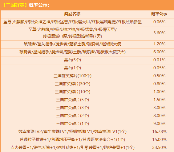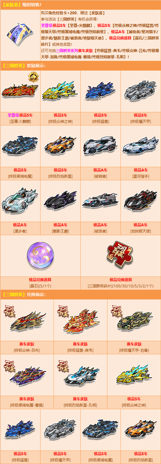 9月27日-10月12日,购买角色经验卡+200,赠送【皮肤券】,参与活动【三国群英】有机会获得:至尊级极品S车【至尊·火麒麟】、极品S车【终极众神之神/终极猛兽/终极爆天甲/终极黑域电魔/终极烈焰新星】、极品A车【破晓者/星河猎手/漫步者/魅影王爵/破浪者/地狱银天使】、极品兑换道具【晶石/三国群英碎片】或其他奖励之一!
