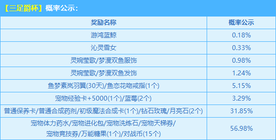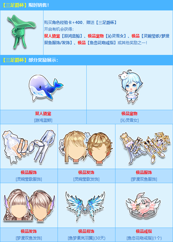 9月27日-10月26日,购买角色经验卡+400,赠送【三足爵杯】,开启有机会获得:双人骑宠【游鸿蓝鲸】、极品宠物【沁灵雪女】、极品【灵婉莹歌/梦漫双鱼服饰/发饰】、极品【鱼恋花吻戒指】或其他奖励之一!