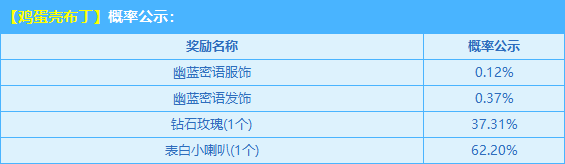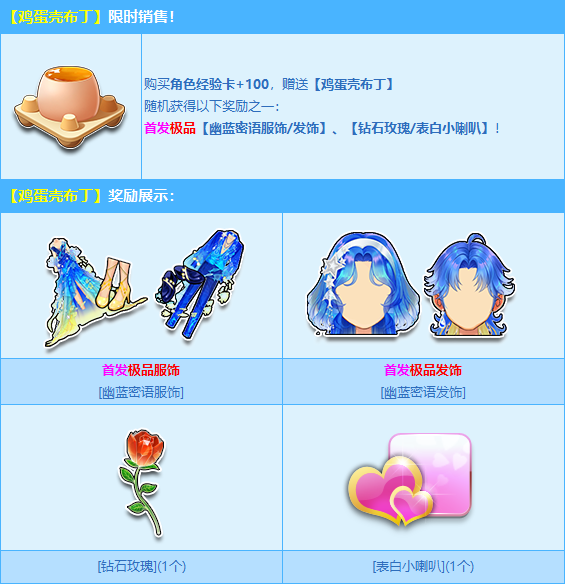 9月27日-10月26日,购买角色经验卡+100,赠送【鸡蛋壳布丁】,随机获得以下奖励之一:首发极品【幽蓝密语服饰/发饰】、【钻石玫瑰/表白小喇叭】!