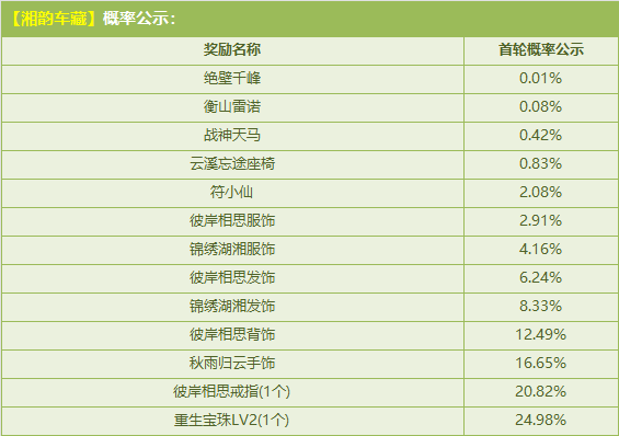 10月1日-11月16日,购买角色经验卡+100*2,赠送【探秘券】,参与活动【湘韵车藏】有机会获得:首发文创联名极品S车【绝壁千峰】、首发极品A车【衡山雷诺】、极品T1【战神天马】、首发极品双人座椅【云溪忘途座椅】、首发极品宠物【符小仙】、首发极品【彼岸相思/锦绣湖湘服饰/发饰】、首发极品【彼岸相思背饰/戒指】、极品【秋雨归云手饰】、【重生宝珠LV2】!