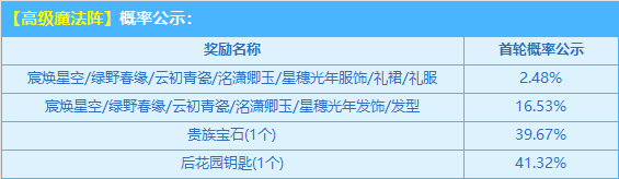 10月1日-10月30日,高级魔法阵奖励全面焕新,参与就有机会赢取:极品【宸焕星空/绿野春缘/云初青瓷/洺潇卿玉/星穗光年服饰/礼裙/礼服/发饰/发型】、人气道具【贵族宝石/后花园钥匙】!