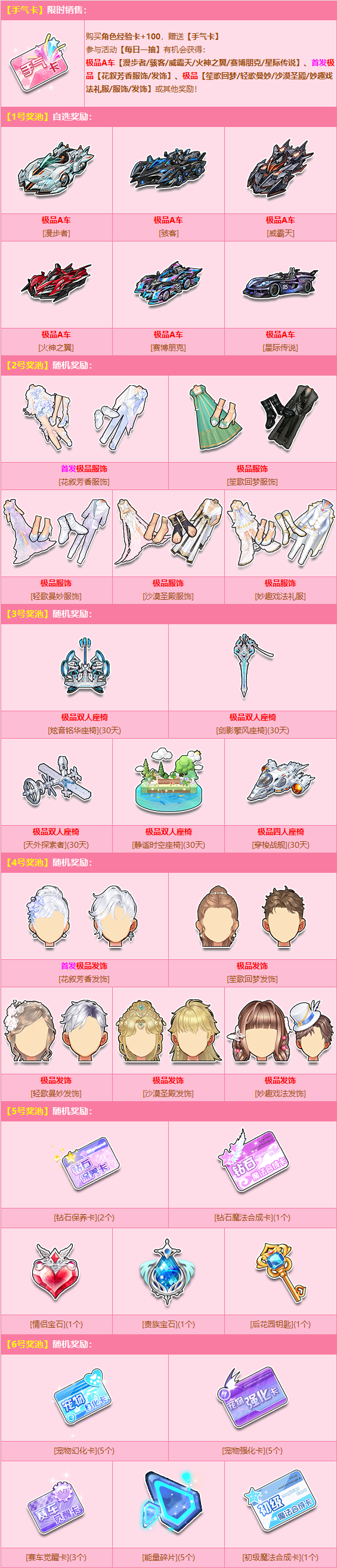 10月1日-10月30日,使用【手气卡】参加每日一抽,即有机会赢取:极品A车【漫步者/骇客/威霸天/火神之翼/赛博朋克/星际传说】、首发极品【花叙芳香服饰/发饰】、极品【笙歌回梦/轻歌曼妙/沙漠圣殿/妙趣戏法礼服/服饰/发饰】等极品奖励!