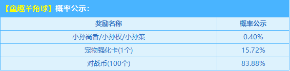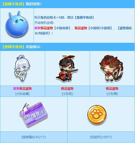 10月5日-11月2日,购买角色经验卡+100,赠送【童趣羊角球】,随机获得以下奖励之一:首发极品宠物【小孙尚香】、极品宠物【小孙权/小孙策】、【宠物强化卡/对战币】!