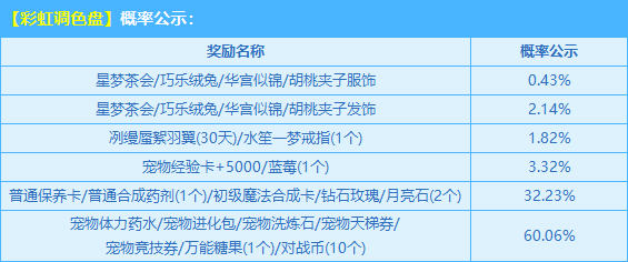 10月6日-11月9日,购买角色经验卡+300,赠送【彩虹调色盘】,有机会得首发极品【星梦茶会服饰/发饰】、极品【巧乐绒兔/华宫似锦/胡桃夹子服饰/发饰】、极品【水笙一梦戒指】或其他奖励之一!