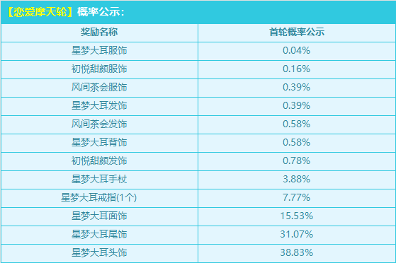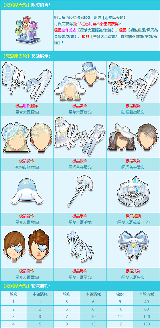 10月1日-10月31日,购买角色经验卡+300,赠送【恋爱摩天轮】,可保底获得(物品栏已拥有不会重复获得):极品动作美衣【星梦大耳服饰/发饰】、极品【初悦甜颜/风间茶会服饰/发饰】、极品【星梦大耳戒指/背饰/手杖/面饰/尾饰/头饰】!