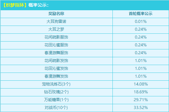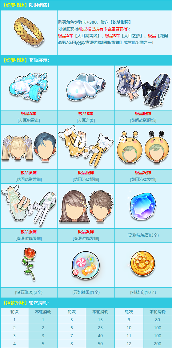 10月1日-10月31日,购买角色经验卡+300,赠送【织梦指环】,可保底获得(物品栏已拥有不会重复获得):极品A车【大耳狗雷诺】、极品B车【大耳之梦】、极品【花间疏影/花田沁蜜/春漫游舞服饰/发饰】或其他奖励之一!