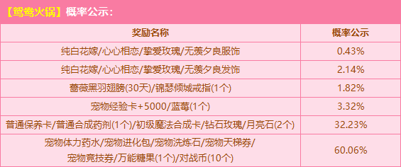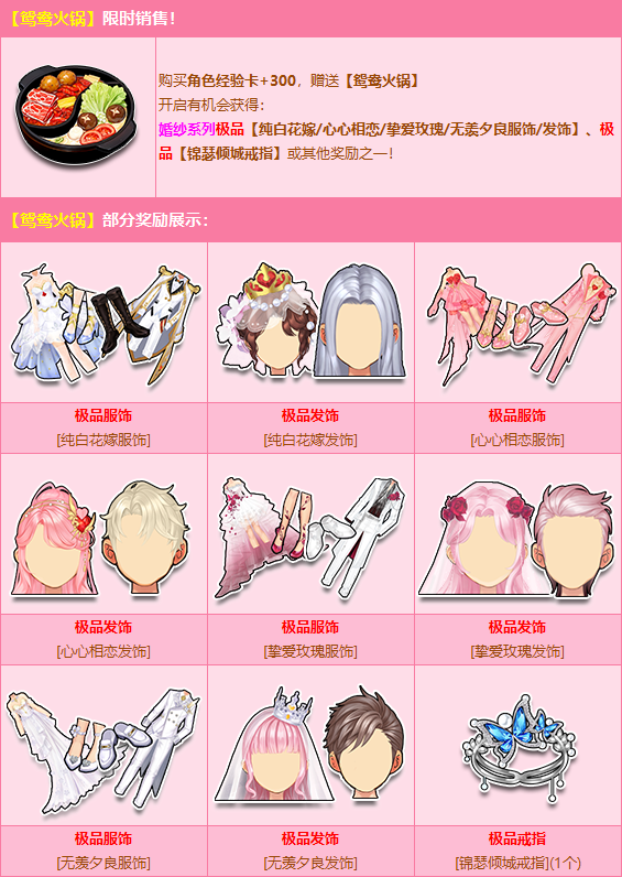10月6日-11月9日,购买角色经验卡+300,赠送【鸳鸯火锅】,有机会得婚纱系列极品【纯白花嫁/心心相恋/挚爱玫瑰/无羡夕良服饰/发饰】、极品【锦瑟倾城戒指】或其他奖励之一!