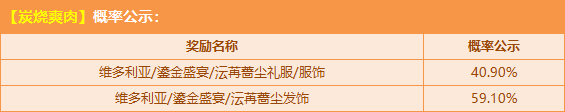 10月1日-11月9日,开启【炭烧爽肉】100%获得钻皇宝石*1,且每个礼包随机一个以下极品奖励(有概率重复获得):皇族专属美衣【维多利亚/鎏金盛宴/沄苒蔷尘礼服/服饰/发饰】!