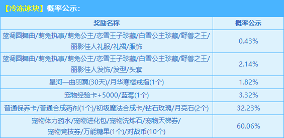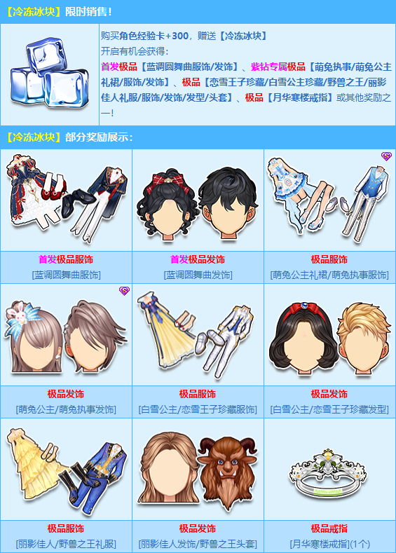 10月7日-11月9日,购买角色经验卡+300,赠送【冷冻冰块】,开启有机会获得:首发极品【蓝调圆舞曲服饰/发饰】、紫钻专属极品【萌兔执事/萌兔公主礼裙/服饰/发饰】、极品【恋雪王子珍藏/白雪公主珍藏/野兽之王/丽影佳人礼服/服饰/发饰/发型/头套】、极品【月华寒楼戒指】或其他奖励之一!