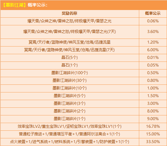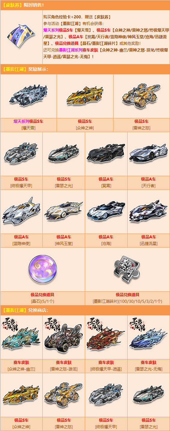 10月1日-10月19日,购买角色经验卡+200,赠送【皮肤券】,参与活动【墨影江湖】有机会获得:爆天系列极品S车【爆天雪】、极品S车【众神之神/雷神之怒/终极爆天甲/雷瑟之光】、极品A车【冥霄/天行者/蓝隐神使/神风玉堂/沧海/迅捷流星】、极品兑换道具【晶石/墨影江湖碎片】或其他奖励之一!