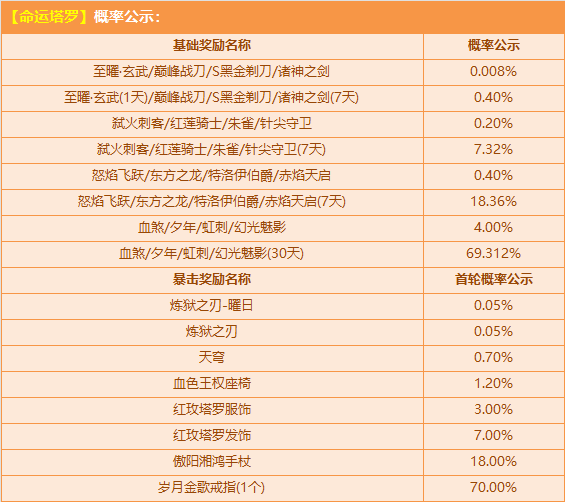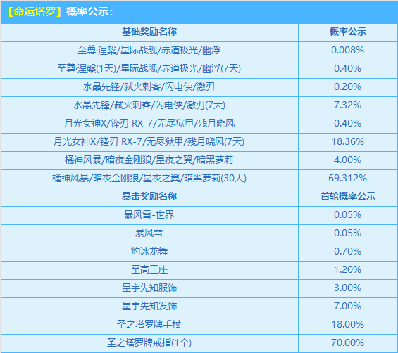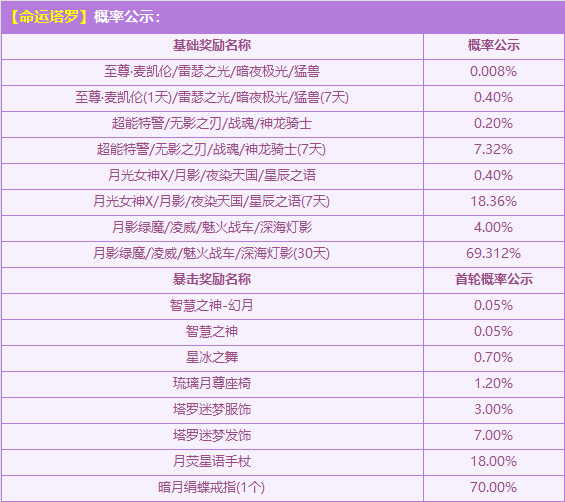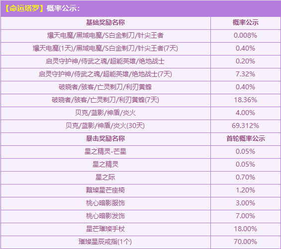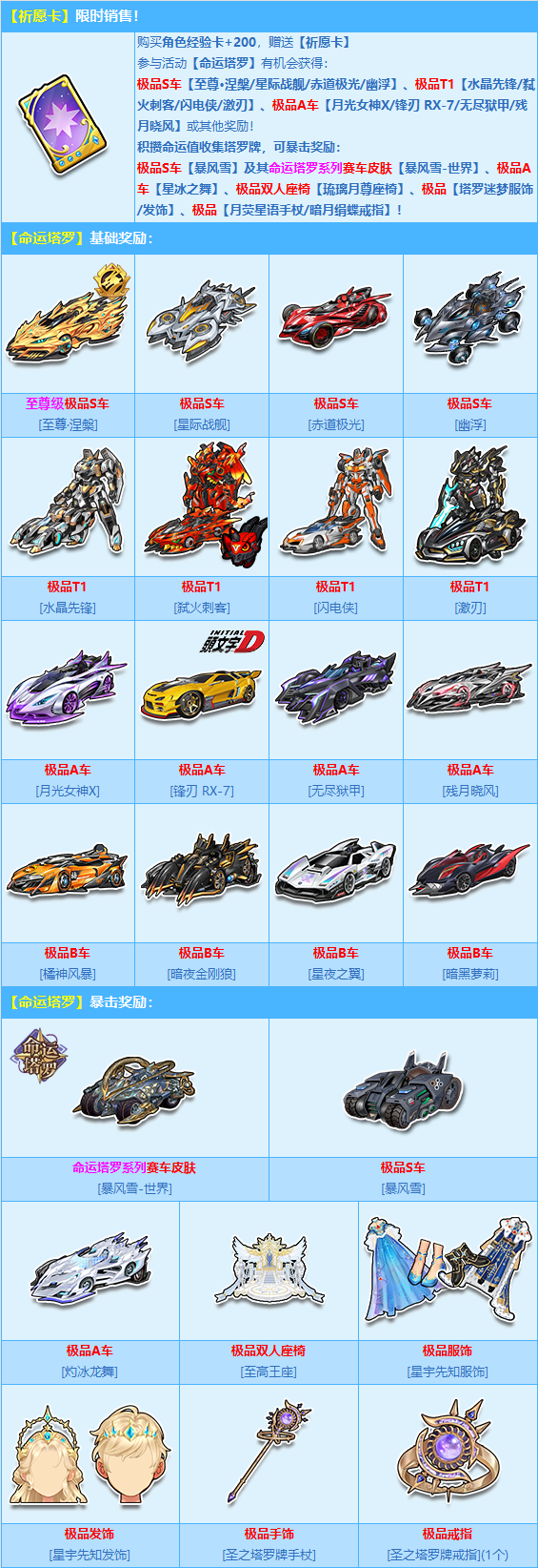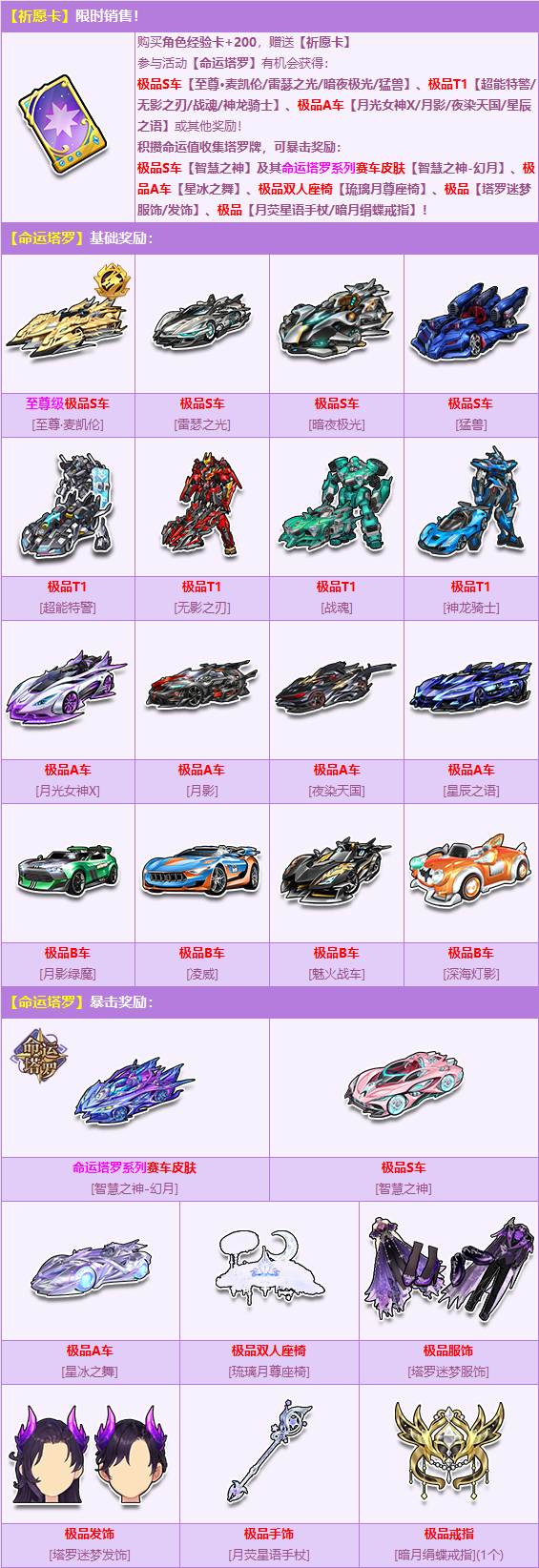10月1日-10月31日,购买角色经验卡+200,附赠【祈愿卡】,参与活动【命运塔罗】有机会获得以下极品奖励:极品S车【智慧之神/星之精灵/暴风雪/炼狱之刃】及其命运塔罗系列赛车皮肤【智慧之神-幻月/星之精灵-芒星/暴风雪-世界/炼狱之刃-曜日】、极品A车【星冰之舞/星之际/灼冰龙舞/天穹】、极品双人座椅【琉璃月尊/黯璨星芒/至高王座/血色王权座椅】、极品【塔罗迷梦/桃心暗影/星宇先知/红玫塔罗服饰/发饰】、极品【月荧星语/星芒璀璨/圣之塔罗牌/傲阳湘鸿手杖】、极品【暗月绢蝶/璀璨星辰/圣之塔罗牌/岁月金歌戒指】或其他奖励之一!
