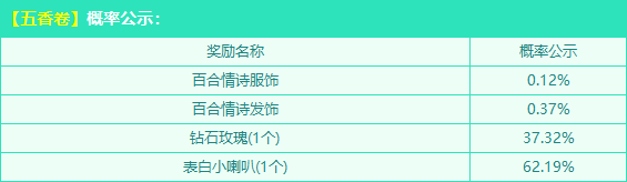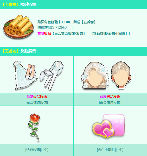 10月8日-11月9日,购买角色经验卡+100,赠送【五香卷】,随机获得以下奖励之一:首发极品【百合情诗服饰/发饰】、【钻石玫瑰/表白小喇叭】!