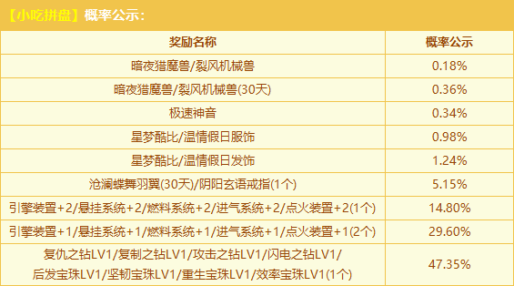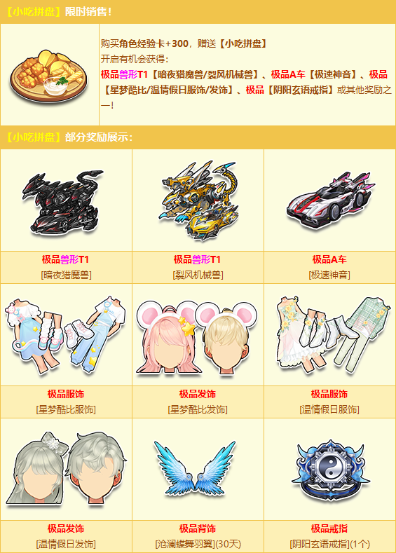 10月2日-11月9日,购买角色经验卡+300,赠送【小吃拼盘】,有机会获得极品兽形T1【暗夜猎魔兽/裂风机械兽】、极品A车【极速神音】、极品【星梦酷比/温情假日服饰/发饰】、极品【阴阳玄语戒指】或其他奖励之一!