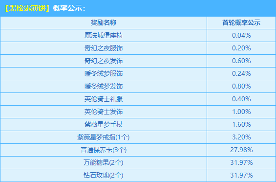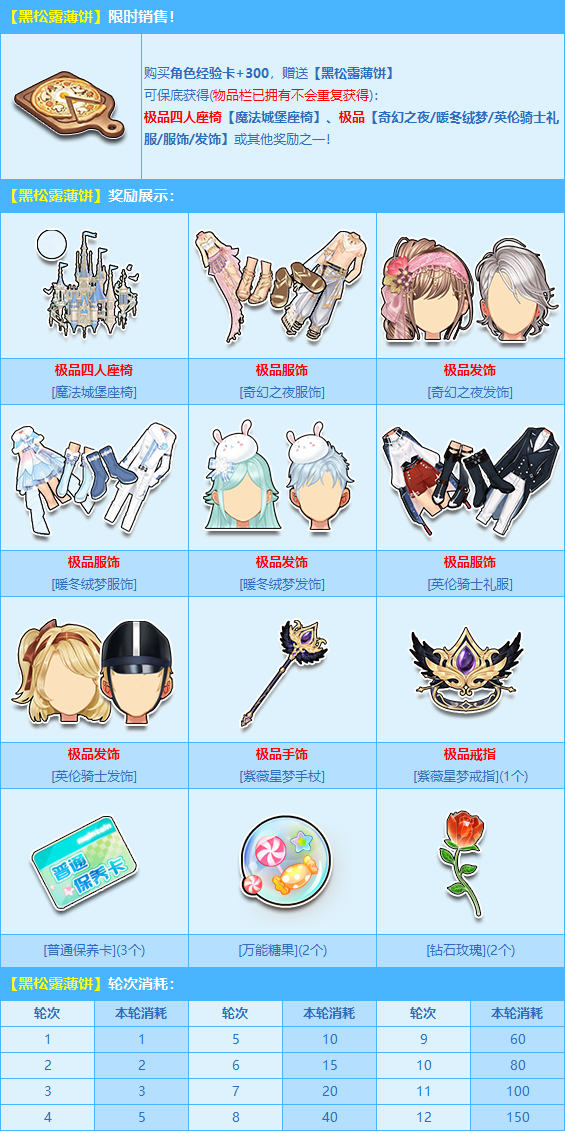 10月3日-11月9日,购买角色经验卡+300,赠送【黑松露薄饼】,有机会得(物品栏已拥有不会重复获得):极品四人座椅【魔法城堡座椅】、极品【奇幻之夜/暖冬绒梦/英伦骑士礼服/服饰/发饰】或其他奖励之一!
