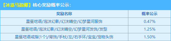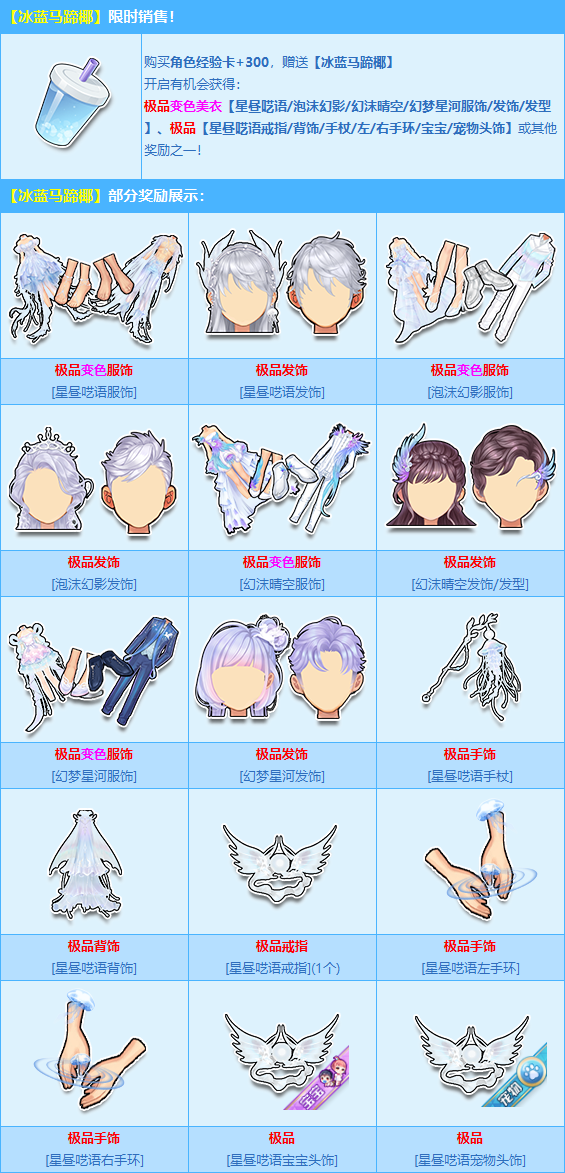 10月4日-11月9日,购买角色经验卡+300,赠送【冰蓝马蹄椰】,有机会得:极品变色美衣【星昼呓语/泡沫幻影/幻沫晴空/幻梦星河服饰/发饰/发型】、极品【星昼呓语戒指/背饰/手杖/左/右手环/宝宝/宠物头饰】或其他奖励之一!