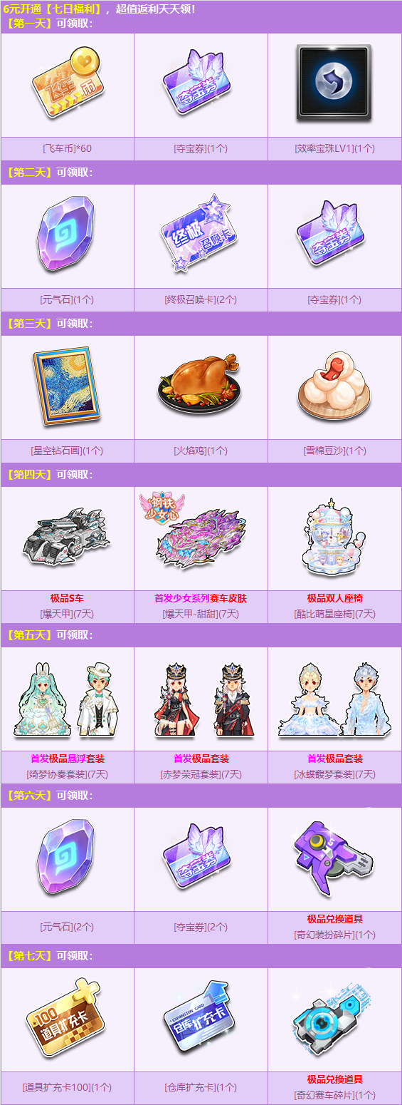10月1日-10月10日,仅需6元开通“7日福利”,即可天天领好礼!首发美衣/人气道具等你领回家,使用极品兑换道具【奇幻装扮碎片/奇幻赛车碎片】即可在【奇迹阁】打造心动极品美衣/极品A级赛车!