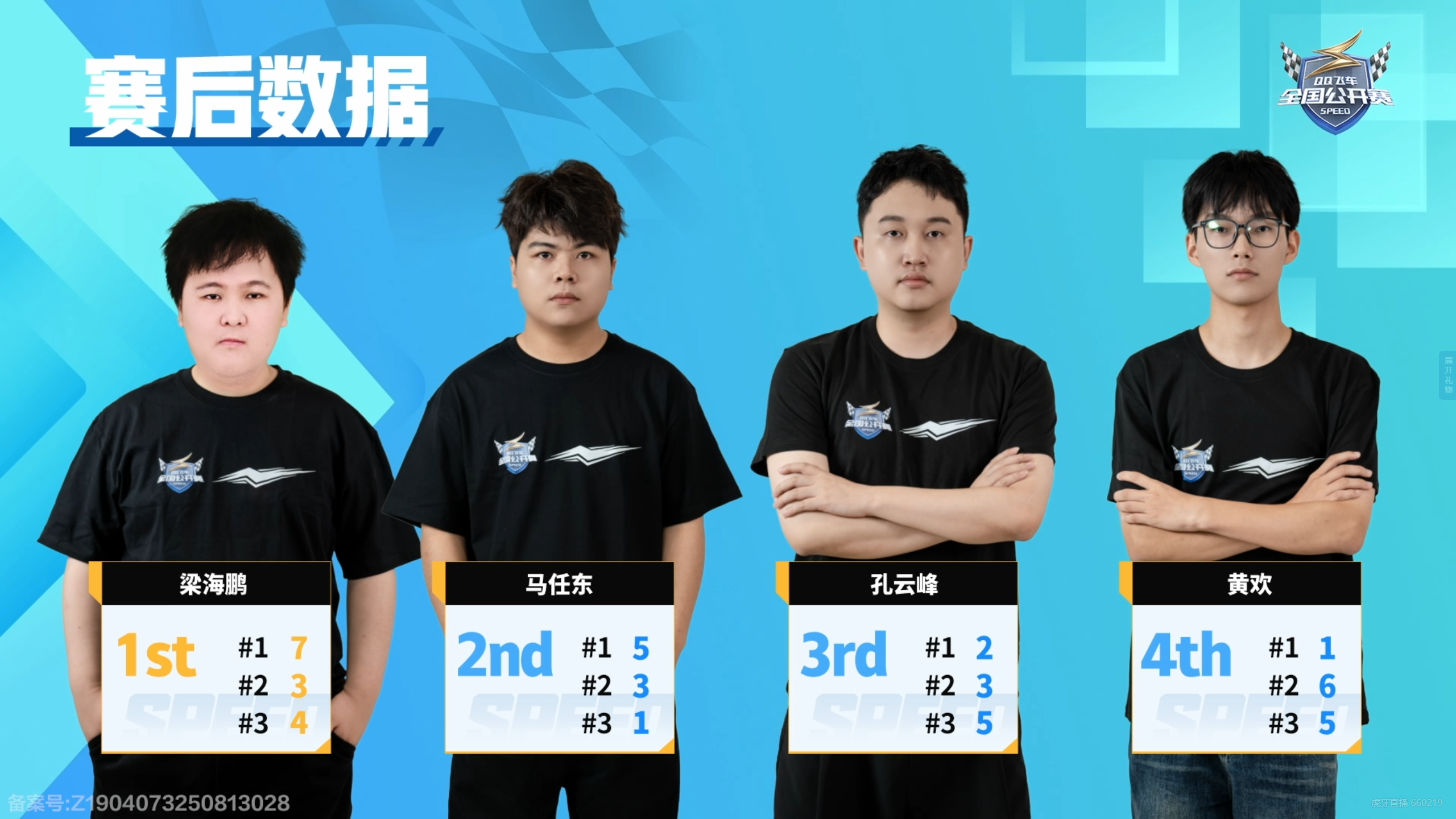 第六张地图VANS机场,马任东冲出后不断拉开与后方选手的车距,场上比分来到4:2:0:0。第七张地图西湖,梁海鹏夺回赛场主动权,全程遥遥领先,拿下第三分。第八张地图桃源剑阁,孔云峰来到领跑位后丝毫不给对手超车机会,拿下属于自己的第一分。第九张地图天玑阁,梁海鹏细节制胜孔云峰来到第一位,同样拿下第四分。第十张地图莫高窟,黄欢的复位失误已无力后追,只能目送梁海鹏拿下第五分。